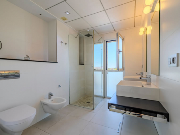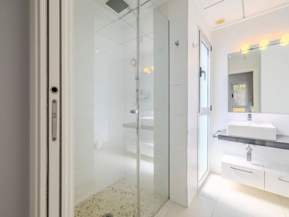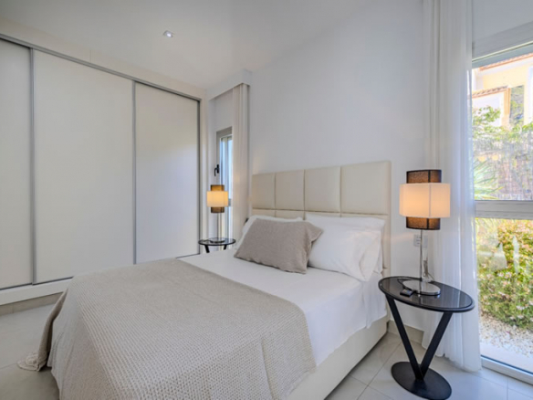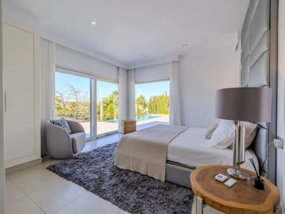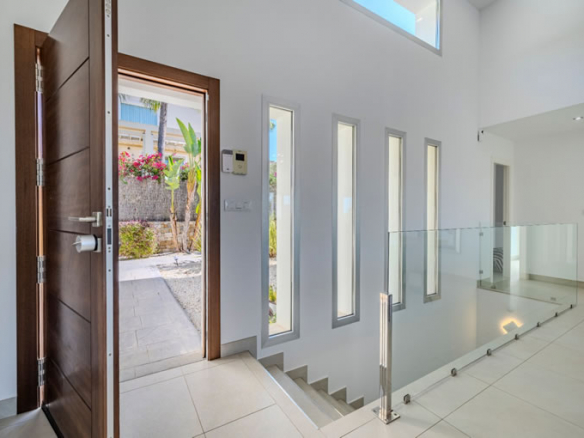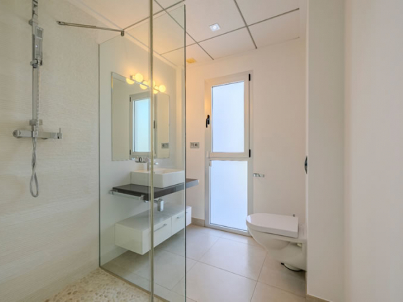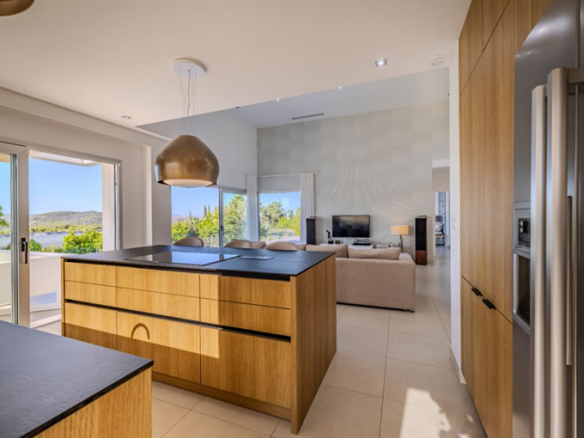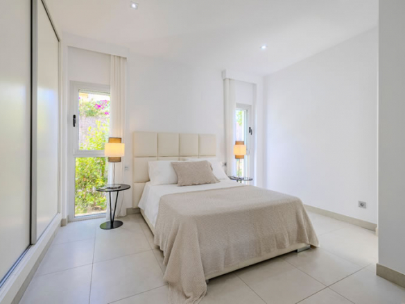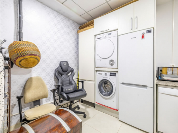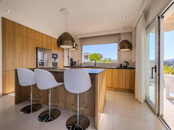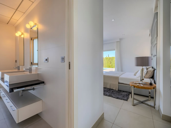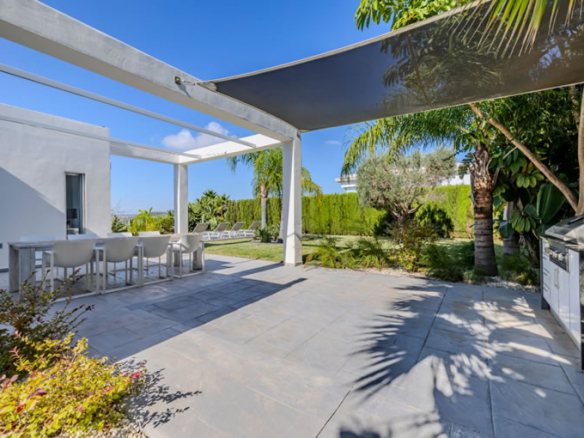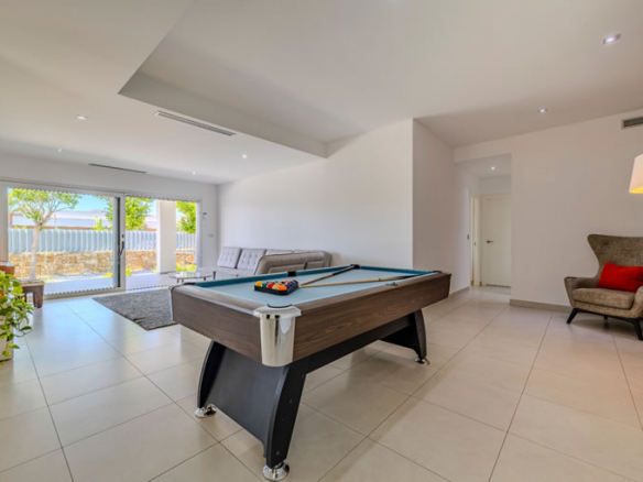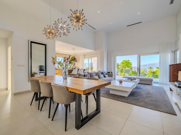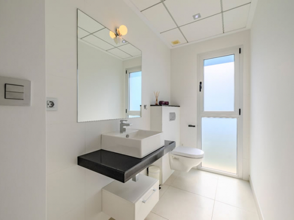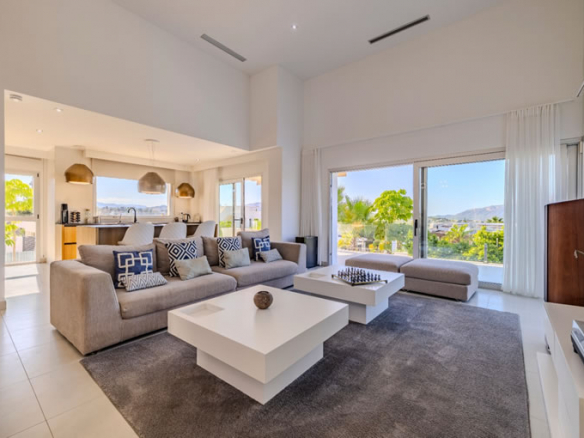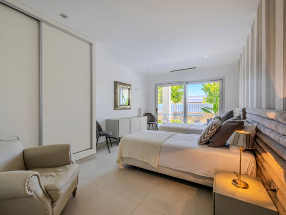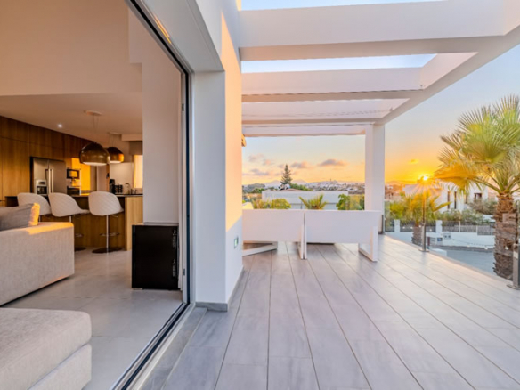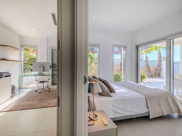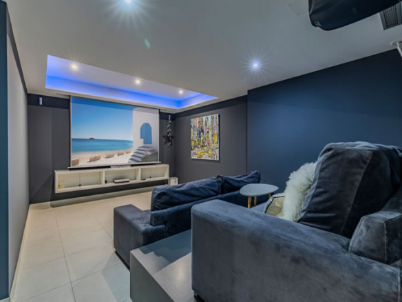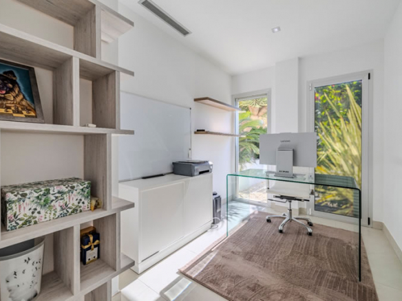 On the lower level, the villa has two further bedrooms, a shower room and lounge, a versatile space ideal for larger families and guests. In addition, there is a home office, cinema room and a large laundry room. There is centralised hot/cold air-conditioning, parking for 2 cars and open and covered terraces.