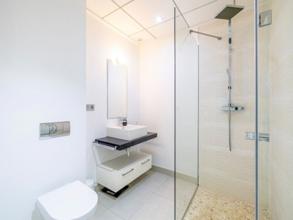The main floor features a bright, open-plan layout with a contemporary kitchen, living and dining areas that open directly onto the pool terrace through large glass doors, bringing in natural light throughout. This level also offers three spacious bedrooms, all with en-suite bathrooms and a cloakroom.