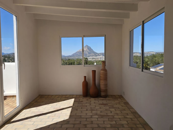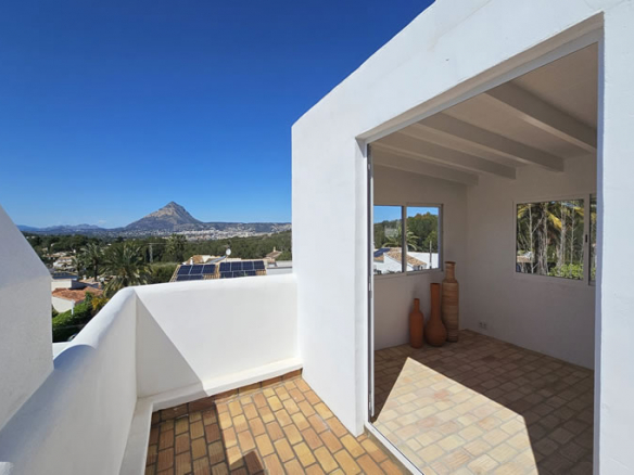 The upper floor presents a bright, airy room with panoramic views of the stunning valley and the iconic Montgó mountain. This room is complemented by a large terrace, perfect for enjoying the breathtaking views and providing a peaceful retreat.