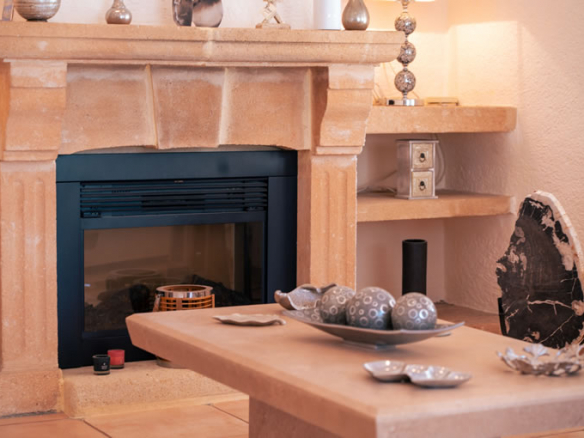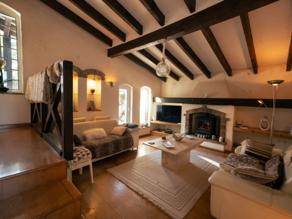 On this main level you will also find the kitchen and dining room, along with three bedrooms. The master bedroom enjoys an en-suite bathroom, while the other two bedrooms share a full bathroom. A large additional room on this floor has been created as a second living room. With its fireplace and warm wooden features, it has a completely different character to the main living space and offers a cosy retreat when the evenings get cooler or when you want to separate everyday life from quiet time.