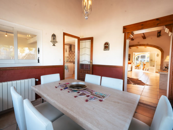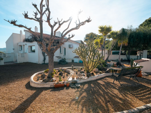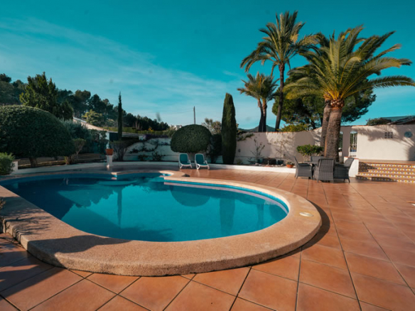 Outside, the villa really comes into its own. The plot is generous and open, with a large south-facing swimming pool that enjoys sun throughout the day. Thanks to the elevated position at the top of La Lluca, the house benefits from open views in all directions, including beautiful views of the Montgó.