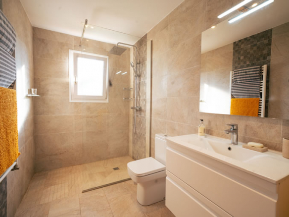 The lower floor houses a fully independent apartment, ideal for guests or extended family. It includes a living area with kitchenette, a bedroom and a bathroom, all with its own access and privacy.
