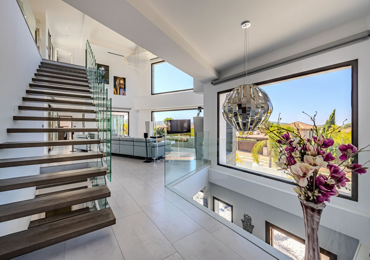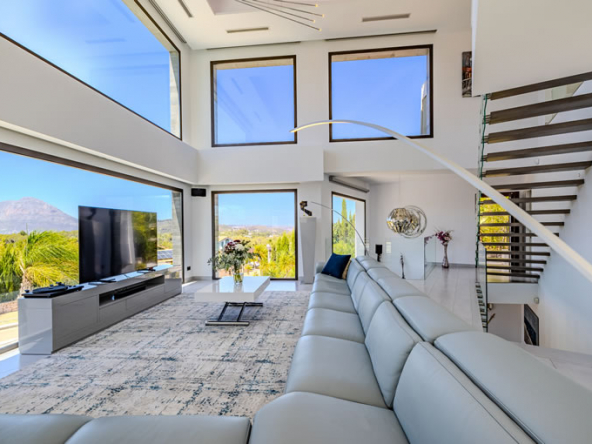 Features: North-west orientation. Panoramic views. Home automation system. Solarium. 18 kw Solar panels. Indoor heated pool. 2 exterior pools. Jacuzzi. Outdoor shower. Electric vehicle charging point. Hot/cold air conditioning. Gymnasium. Sauna. Office. Pergola. Covered BBQ/Kitchen. Sonos sound system. Double height ceilings. Close to town & the golf course