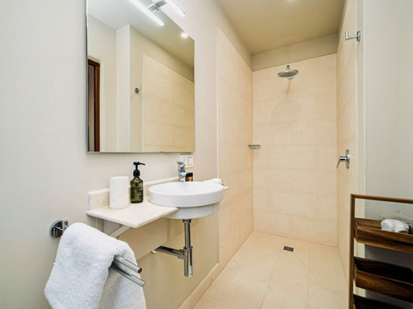Spread over three levels, the main floor features a spacious entrance hall, a bright living-dining room with access to the interior patio and the classic naya, a fully equipped open-concept kitchen, guest toilet, laundry room, one bedroom with en-suite bathroom, and another bedroom with independent access and private bathroom, perfect for guests or family members seeking privacy.