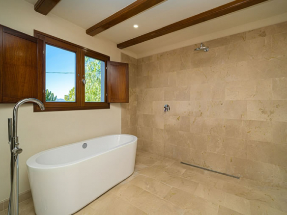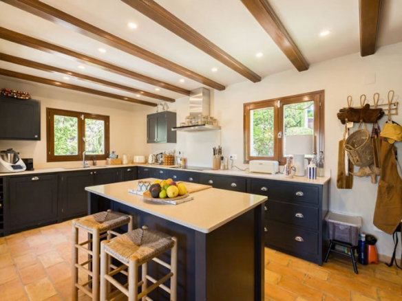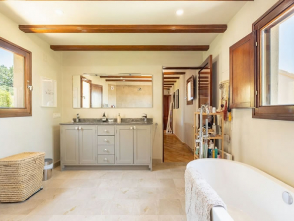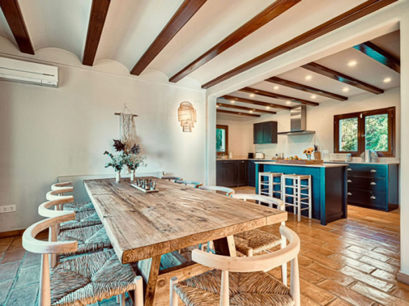 The home has been exquisitely renovated with great attention to detail, preserving local architectural elements and incorporating noble materials such as terracotta flooring, natural wood beams, and large windows that bring in warmth and natural light. It offers year-round climate comfort with electric underfloor heating in all four bathrooms and central heating with condensing radiators throughout the rest of the house. The property also includes a covered carport with space for two vehicles.
