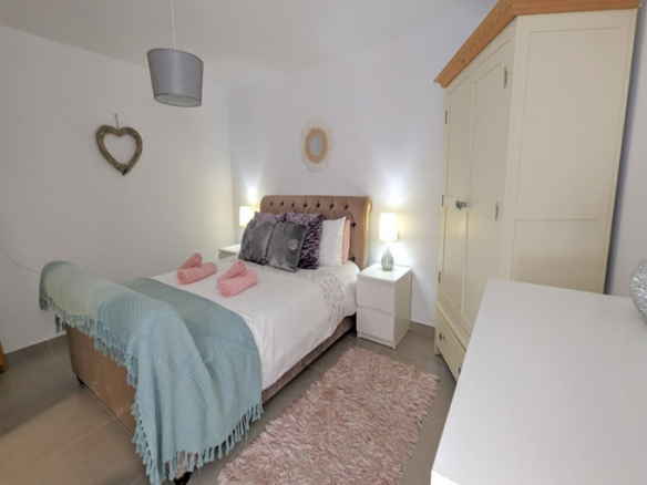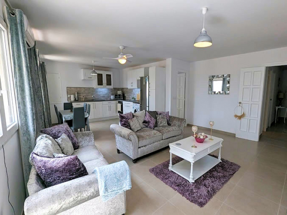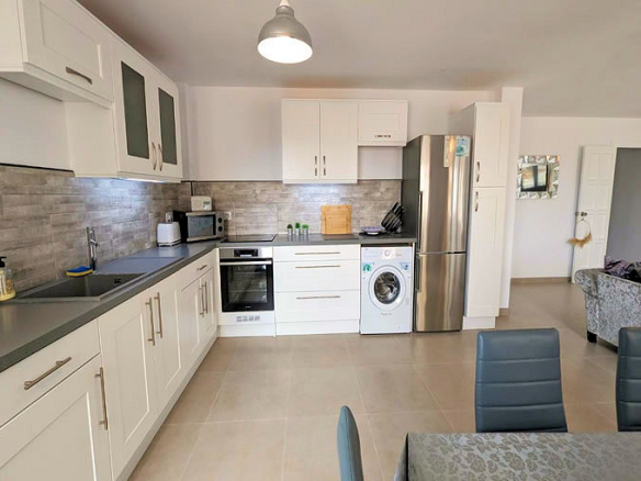 The accommodation, beautifully reformed (including all new plumbing and electrics) and decorated, is distributed on one level on the first floor with lift access. You enter via the front door into a hallway from which is a double bedroom, a family bathroom with access to the beautiful open plan living / dining / kitchen area. This area has patio doors to small balconies overlooking the road. The kitchen is fully fitted with oven, hob, fridge freezer and washing machine. From the living area there is a second hallway to 2 more double bedrooms both of which are en-suite and have fitted wardrobes and the master having access to a private terrace.