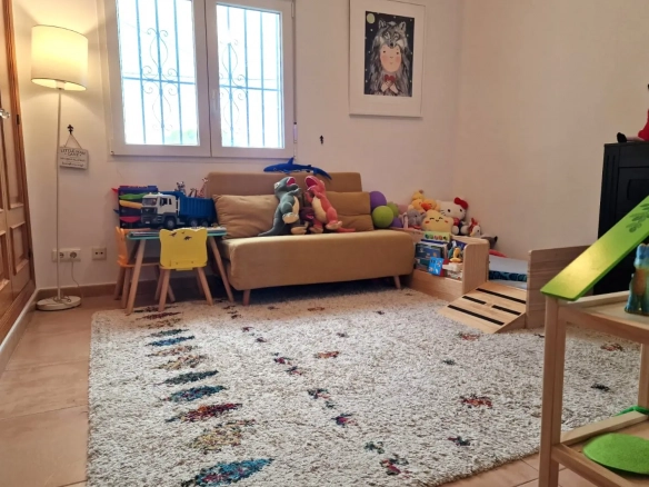 On the ground floor, you’ll find a garage with an electric car charging station, remote-controlled gates, and a multi-purpose room with air conditioning and a private bathroom—currently used as an office but easily converted into a bedroom.