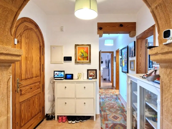 The upper floor opens to a sunny terrace with sea and Montgó mountain views, a spacious living and dining area with a Jøtul Norwegian wood stove and air conditioning, and a fully renovated kitchen with brand-new Siemens appliances. Two double bedrooms each having their own bathroom and air conditioning.