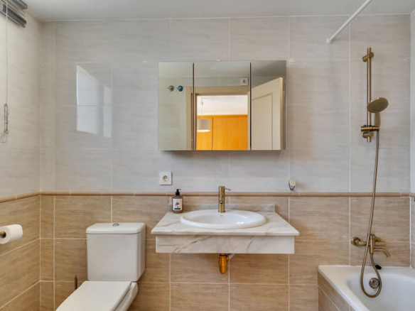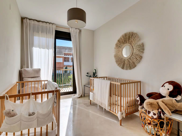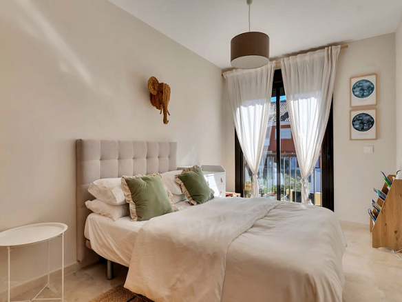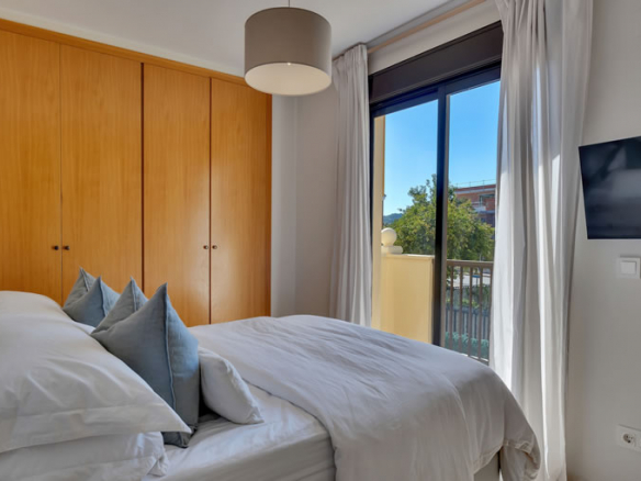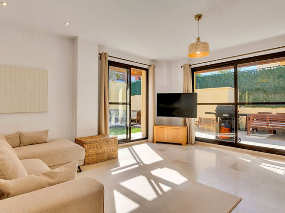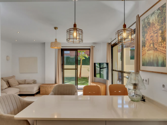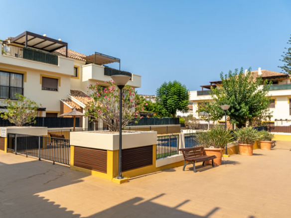 Outside, you’ll find a private garden with terraces and a grass lawn area, perfect for relaxing or outdoor dining. The residential complex includes a communal pool, ideal for enjoying the sunny climate.