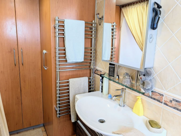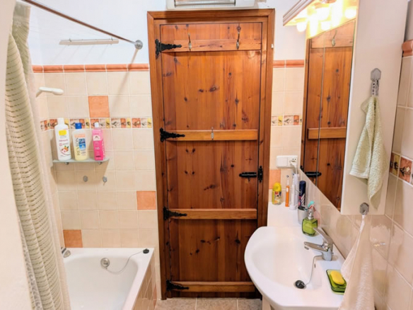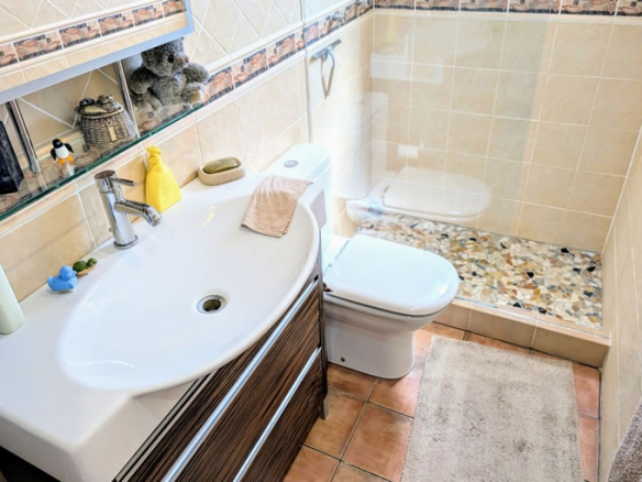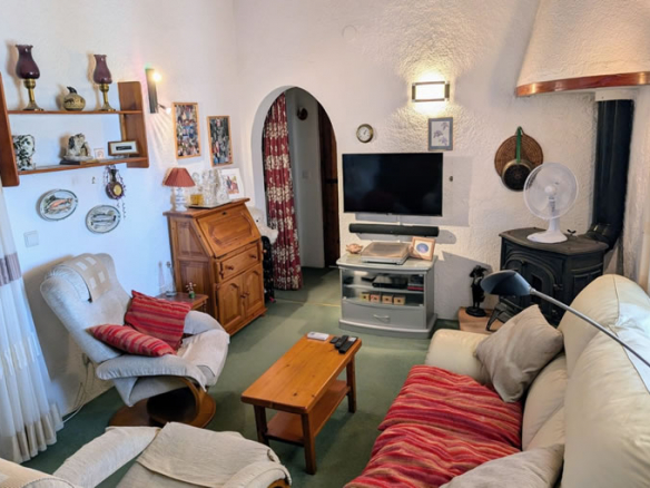 Through an archway you enter the living room which has a corner fireplace and wood-burning stove, through another archway you enter a small hallway. To the left is a double bedroom with built-in wardrobes, straight ahead is the house bathroom which includes a vanity unit and bath with shower attachment, at the far end of this bathroom there is a utility area. To the right is the master bedroom which has built-in wardrobes and an en-suite bathroom including dressing area, vanity unit, heated towel rail and a walk-in shower.