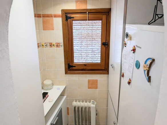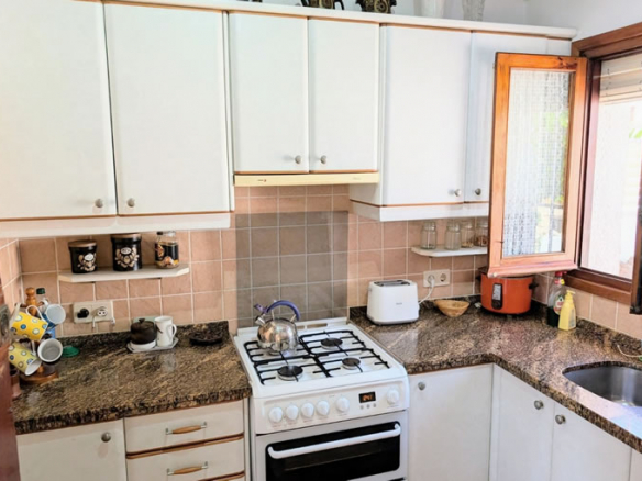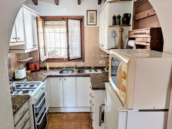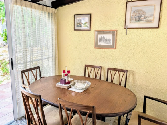 The villa is distributed on one level and it is situated in a quiet cul-de-sac. You arrive at the property, park in the carport and then go down a few steps to the front garden. You enter the villa through glass sliding doors into a dining room and then into the small but well fitted and equipped kitchen with granite worktops.